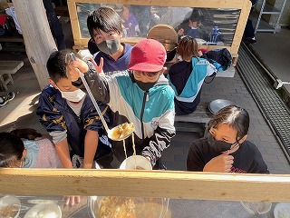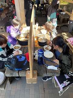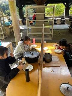 ごはんとすき焼き風煮が出来上がり,昼食の時間です。火をつけるところから,全てをやり切った子どもたち,とても美味しそうに食べています。おかわりをする子もいて,お腹いっぱい食べました。