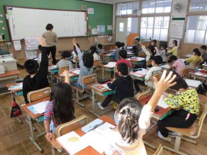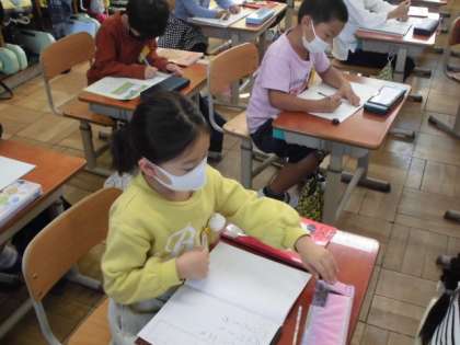 国語の時間には,カタカナのことばを書く練習をしました。「すいか」「けえき」「かえる」などカタカナで書くとどうなるのか,考えてノートに書きました。のばす音のところは「−」を使って「ケーキ」と書くようにしていました。