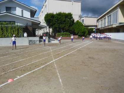今日の体育科では運動場で,100メートル走と団体演技「風の結人」の練習を行いました。100メートル走の練習では初めて並び方を確認しましたが,素早く覚えて次々とスタートすることが出来ました。また,団体演技の練習では体育館で練習したときと同じように隊形移動をスムーズに行い元気良く踊ることができました。
