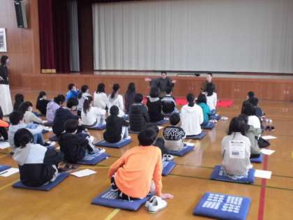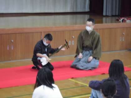 6年生は,「ようこそアーティスト」で長唄のことを学習しました。昔から伝わる三味線音楽の一つで歴史があります。今日は,2人の方に来ていただき,長唄や三味線のことを教えていただきました。後半には,三味線をひく体験もできました。思った以上に難しく感じていたようでした。