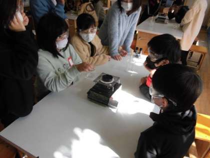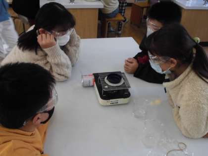 食塩やミョウバンを水に溶かしてみたところ,透明な水よう液ができました。では,とけたものを取り出すことはできるのか考えました。「ろ過する」とか「冷やす」などといった予想がロイロノートで提出されたましたが,今日は,蒸発させる実験をすることにしました。しばらく熱すると,お皿に何か白いものが浮かび上がってきました。