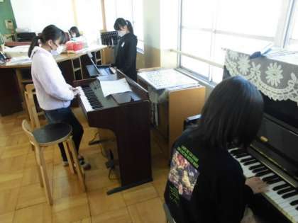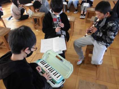 音楽の時間にはみんなで合奏に取り組んでいます。リコーダーや鍵盤ハーモニカなど経験のある楽器だけでなく,鉄琴や木琴,ピアノなどたくさんの楽器を使って演奏します。各楽器に分かれて練習に励んでいました。