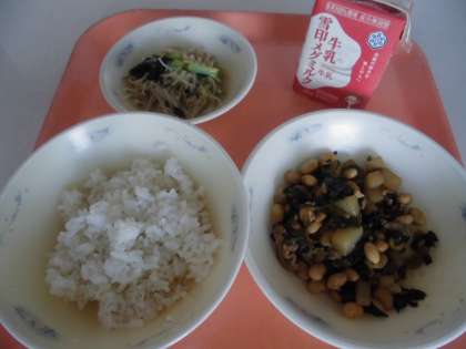 『肉みそいため』は,にんにく・しょうが・料理酒としょうゆで下味をつけておいた豚肉・しいたけこんにゃく・大豆・ほうれん草を炒めて,赤みそ・八丁みそ・さとう・料理酒・しょうゆ・しいたけの戻し汁を合わせて作った調味液で調味して,仕上げました。