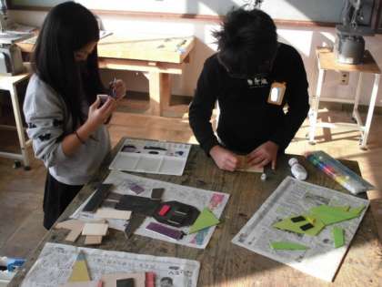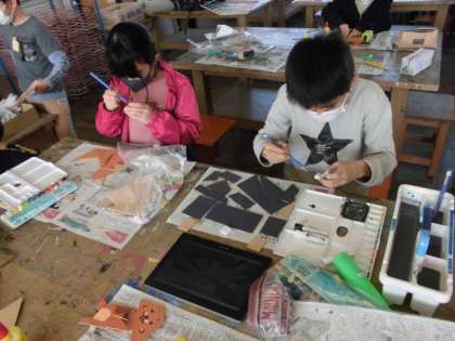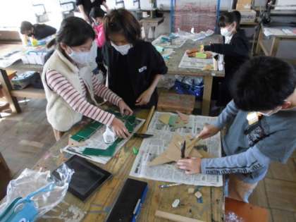 自分の描いた線をもとにのこぎりでいろんな形に切っています。切れたものからイメージを広げていろんなものを作ります。今日は,切った木に絵の具で色を塗りました。その後,釘で固定しやすくするためにボンドで固めてから釘を打つようにしていました。
