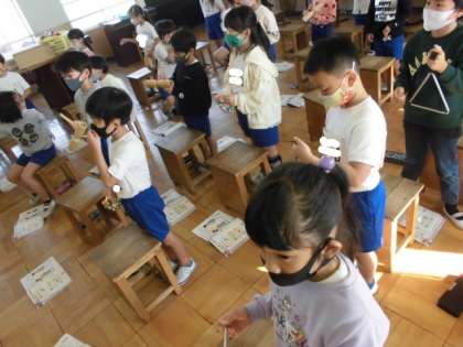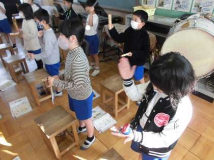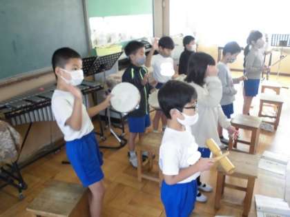 今日の音楽では,音楽室に行っていろんな楽器を演奏しました。カスタネットや小太鼓,タンブリンなどを使ってリズム打ちをしました。先生の合図で「タン タ タ タン ウン」とか「ターン ターン ウン」などのリズムに合わせてたたいていました。
