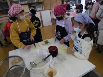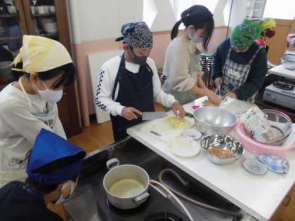 今日の家庭科では,調理実習でみそ汁を作りました。前の時間にグループで役割分担していたので,だしをとる係やあげを切る係などに分かれて作業を開始しました。お互いの作業を見ながら声をかけ合い,協力することができました。