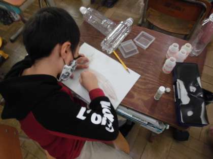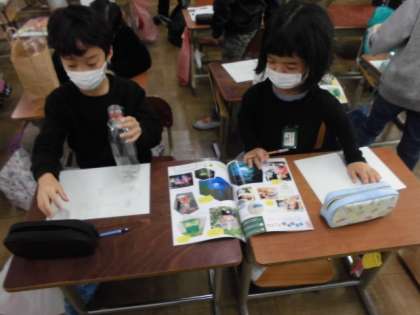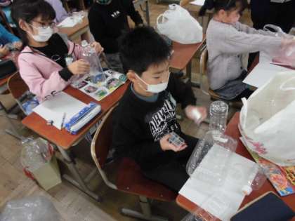 卵のパックやペットボトル,プリンカップなど透明の容器を使って,作りたい生き物を考えました。たてや横にして積み上げたり並べたりして何が作れるかいろいろ試していました。プリンカップを見て「生き物の足にしたらいいんちゃう?」と気付いたことをアドバイスし合う姿も見られました。どんな生き物が出来上がるか楽しみです。