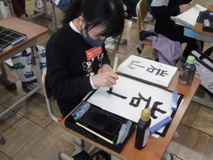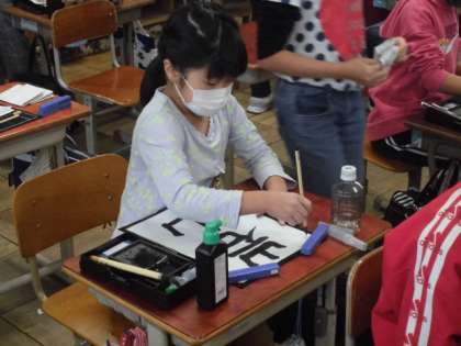書写の時間に「岩山」という字を書きました。「山」という字が2回出てきますが,大きさが違います。上下の組み立て方に気を付けて集中して書いていました。
