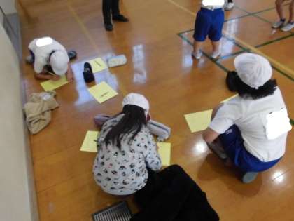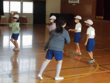 体育では,リズムダンスに取り組んでいます。選んだ曲ごとにグループを作って,動き方を考えました。曲調をつかんでのりのいいダンスができるように,みんなで話し合いながら動きを決めていました。動きながら思い浮かんでくる動きもあり,どんどん工夫していました。