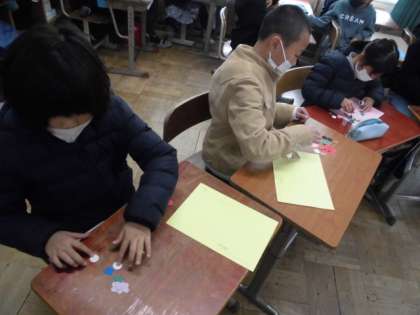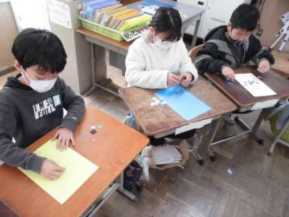 今日の外国語活動の時間では,英語でやり取りしながら自分の欲しい色の形を集めました。「What do you want?」という言い方で尋ねられると「I want 〜」と自分の欲しい色の形を言います。そういったやり取りを繰り返しながら,色のついた四角形や三角形などを集めました。その後,集めた形を使ってクリスマスカードを作りました。green triangleを重ねて貼ってツリーを作っている子もいました。
