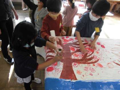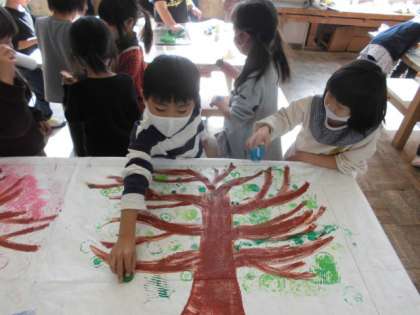 今日は大きな紙に描かれた木に野菜やラップの芯,ペットボトルのキャップなどを使って花を咲かせたり葉っぱを付けたりしました。赤や緑をベースにしていますが,いろんな色や形があって,とてもきれいな木が出来上がりました。