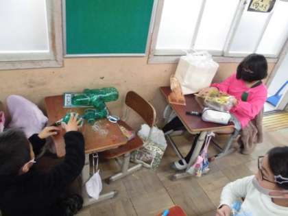 図工の時間には,ペットボトルなどの透明の容器を使って,クリスタルアニマルを作っています。組立が終わってマジックで色を塗っていくと,どんな生き物を作っているかだんだん見えてきます。光を通すので,きれいな色の生き物ができていました。