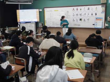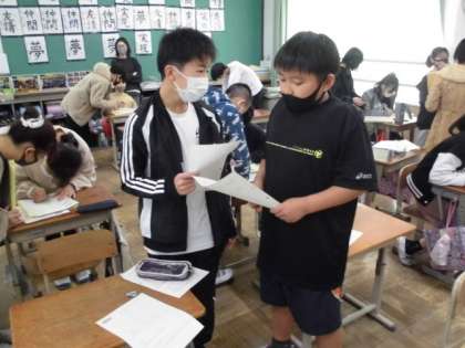 外国語の時間には,自分が将来,なりたい職業について英語で紹介しました。「What do you want be?」と尋ねられると「I want to be 〜」となりたい職業の名前を答えます。さらに「Why?」と聞かれるので,理由も英語で答えていました。少しずつ英語に慣れてきているようでした。