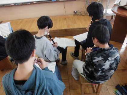 音楽の時間に「キセキ」という曲の合奏に取り組んでいます。リコーダーをはじめ鍵盤ハーモニカ,木琴,鉄琴などいろんな楽器に分かれて練習してきました。楽譜をもとに強弱も考えながら演奏すると,各パートが奏でる音がうまく組み合わさってきれいな音色となっていました。