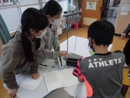 理科の時間では,ふりこの動きについて1往復する時間が変化するかどうか実験しました。今日は,ひもの長さを20cm,40cm,60cmと3段階に調整しながら,時間を計測しました。結果をもとに,ひもの長さが変わると1往復する時間がどうなるのか考えていました。