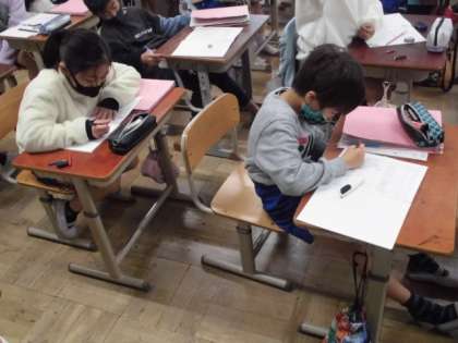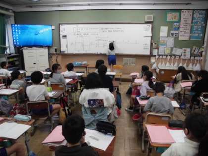 算数の時間には,5/8と3/8のどちらが大きいのか考えました。リットルマスで考えたり数直線で考えたりといろんな考えが出てきました。どの考え方にも「8等分」という言葉が出てきたので,何を8等分しているのかみんなで確認しました。いろんな考えのいいところに共感することはとても大切です。最後に,数の大小を表す記号を思い出してノートに書きました。