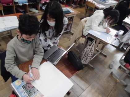 今日の図工は,木版画に取り組みました。体育参観で披露した鳴子踊りの姿から自分の気に入ったポーズを選んで下絵を描きました。足の向きや体の各パーツの大きさなど思っていることがなかなか表現できず苦労していました。