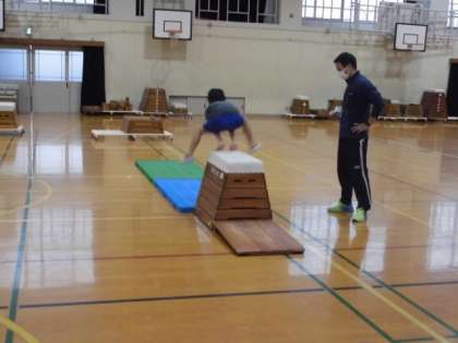 体育の時間には,とびばこに挑戦しました。高さや大きさの違う跳び箱の中から,自分が跳び越せそうなものを選んで開脚跳びに挑戦しました。踏み切り板を利用してふわっと体を浮かせてジャンプしている子もいました。