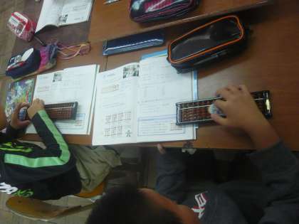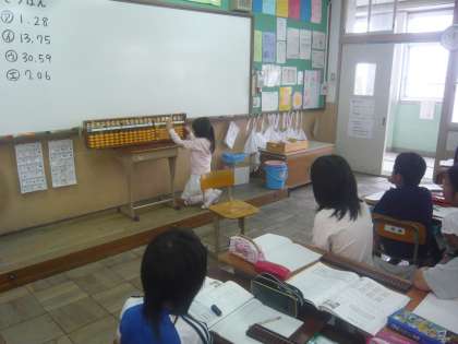 算数科では「そろばん」の学習を行っています。今までの学習を振り返りながら小数をそろばんに入れたり払ったりしています。小数の足し算・引き算も今までと同じ手順で計算できることが分かり,そろばんでの計算を楽しんでいる様子でした。