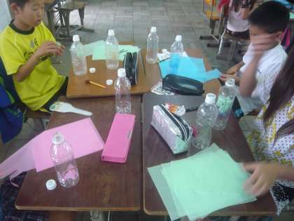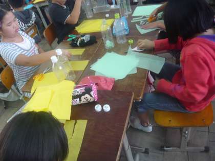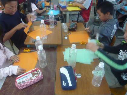 図工科では運動会の団体演技で使う道具を作りました。団体演技「風の結人」では,両手にペットボトルを持ちます。そのペットボトルに花紙を入れて綺麗な道具が出来上がりました。運動場でそのペットボトルを持って踊ると演技が更に華やかになりました。
