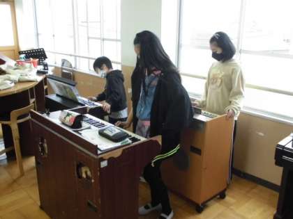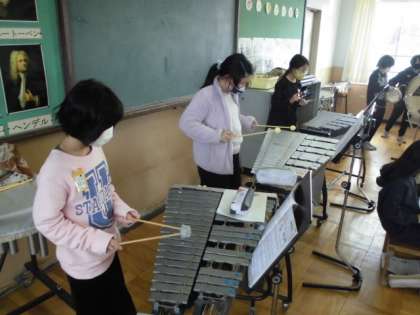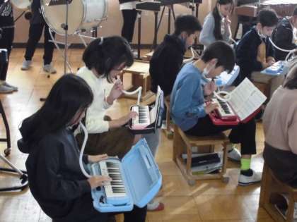 今日の音楽では,茶色の小びんという曲の合奏をしました。楽器ごとのパートに分かれて練習してきましたが,今日は音を合わせる日です。楽譜上に記されている休符で休むことや他の楽器との音のバランスなどに気を付けながら演奏していました。