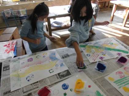 前の時間には,画用紙にローラーで色をつけました。今日は,その画用紙に野菜やキャップなどを使ってスタンプしました。絵の具の色だけでなく量にも気を付けながら,思い思いの場所に押し付けていました。