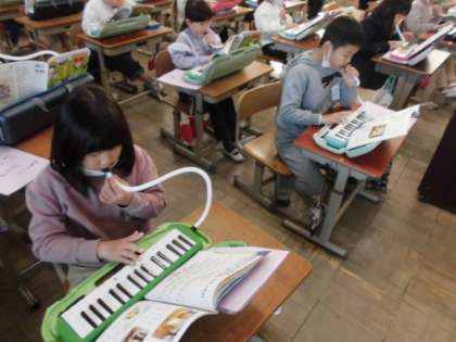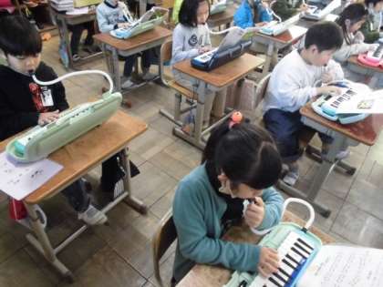 音楽の時間には,「小ぎつね」という曲を鍵盤ハーモニカで演奏しました。楽譜にある音が出せるように指づかいを気を付けていました。