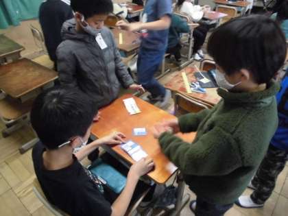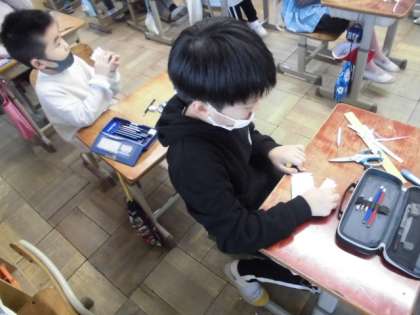 国語の時間には,おもちゃの説明書を書くため,実際に牛乳パックを使っておもちゃを作ってみました。ペットボトルのキャップと組み合わせた「こま」か輪ゴムと組み合わせた「ぴょんぴょんガエル」のどちらかを選んで作りました。おもちゃを作る時にどんな説明があれば分かりやすいか考えていました。