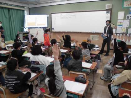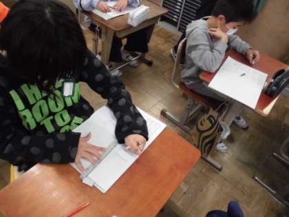 算数では,1/5と2/5を合わせるといくつになるか考えました。それぞれの分数が表す量をリットルマスで確認した後,合わせるとどうなるのか表した式の計算方法も考えていました。