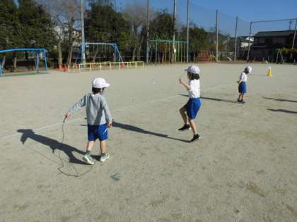 今日の体育では「なわとび」をしました。両足跳びや片足跳び,かけあし跳びなどいろんな跳び方の中から1つ選んで,何回跳べるか挑戦しました。跳んだ回数を忘れないようにペアになったお友達に回数を数えてもらうようにしました。
