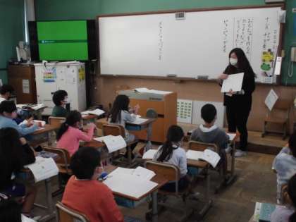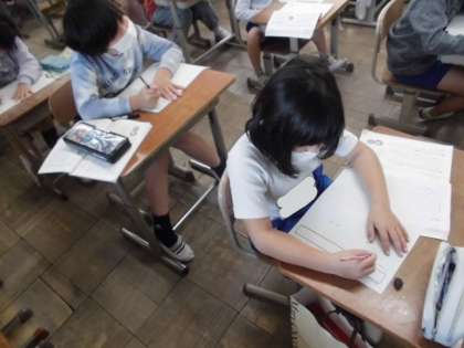 前の時間には,牛乳パックを使って「こま」や「ぴょんぴょんガエル」を作りました。今日は,そのおもちゃを作るために必要な材料や道具を確かめました。自分が作ったことを思い出しながら,必要なものを考えていました。