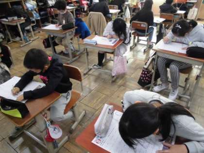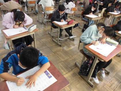 新しい漢字を学習すると,何度も書いて覚えてきました。知っている漢字は普段から使うようにしていますが,テストとなると少し緊張もあり,思い出せない字もあったりします。今日は,まとめのテストに挑戦しました。静かな雰囲気でよく考えながら書いていました。