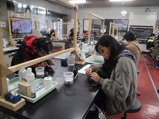 化学の教室では,電池の中身や仕組みについて知り,様々な材料を使って手作り電池を作りました。普段できない観察や実験ができ,楽しんで学習することができました。