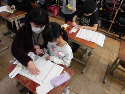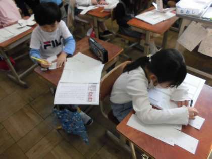 牛乳パックで作ったおもちゃの作り方を説明するために,どんな順番ではさみで切ったりテープでつけたりしたのか手順をおさらいしました。だんだん分かってきたので,「まず」「つぎに」「それから」「さいごに」というふうに4つの段落に分けて説明する文章を書きました。自分では分かるけど言葉で何と書けばいいか悩んでいる子もいました。