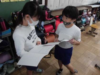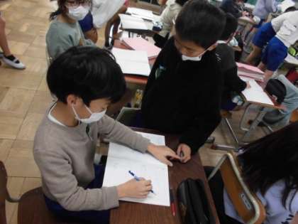 算数の時間には,文章問題に挑戦しました。7cmのつみきと4cmのつみきを6個ずつ積んだ時,どちらの方が高くなるのでしょう。今日は,問題を解く際に,「まとまり」「ばらばら」と2つのやり方で解くように考えました。なんとなく答えが分かりかけてきたけど,どんな式にすればいいかしっかり考えていました。