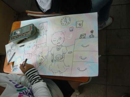 図工科では「お話の絵」の学習を行っています。子どもたちは,先生が朗読したお話を聴いて想像したことを思い思いに描いています。下書きが終わり絵の具を使って描く段階に入ってきていますが,筆づかいや色合いを考えながら丁寧に作品を完成させていきたいと思います。