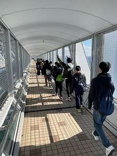 最初のスポット「渦の道」で,鳴門の渦潮を橋の上から見ます。鳴門大橋の下の専用通路を通って,橋の真ん中まで進み,床のガラス越しに,渦潮を見ています。通路のあまりの高さに,こわごわ進んでいました。いくつもの渦潮を見ながら,自然の作り出す光景に感動していました。