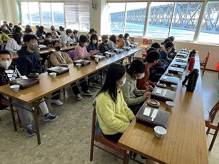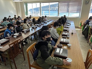 渦の道の見学を終えた6年生は,鳴門公園内で昼食をとりました。朝も早かったので,お腹はペコペコです。窓の外に広がる雄大な鳴門大橋を見ながら,ごはんをお腹いっぱい食べて,午後からの活動に備えています。