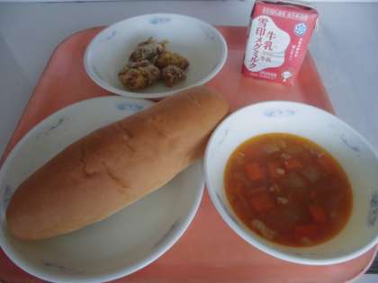 子供たちから,「『スパイシーチキン』は,外はカリカリで,中はジューシーでおいしかったです。『ミネストローネ』は,マカロニがやわらかくて,とってもおいしかったです。」と,感想をくれました。