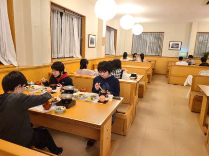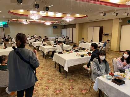 今回の修学旅行も感染対策を徹底しています。バスに乗る前や到着した後などに検温をしたり,手指消毒をしたりしています。マスクの着用はもちろんですが,夕食の時も密にならないように着席して食事をしています。