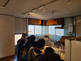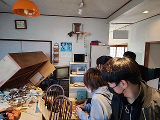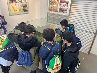 施設内に入り,班ごとに見学をしています。地震後の家を再現した展示を見て,地震の恐ろしさを感じ,どう身を守ればよいかを考えていました。断層の模型を見て,地震の仕組みについても学んでいました。