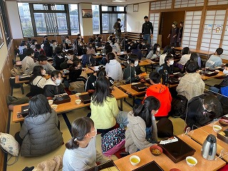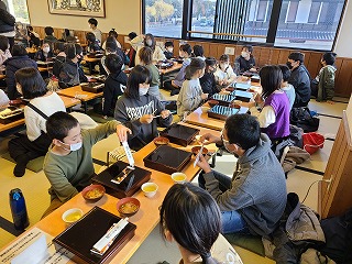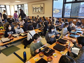 6年生は予定通り姫路に到着しました。姫路城の見学の前に昼食をとります。これから広大な姫路城を散策していくためにも,しっかり昼食を食べ,エネルギーを補給しておきます。天気にも恵まれ,子どもたちは元気に過ごしています。