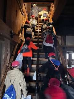 遠くから悠然と華麗にそびえたっていた天守閣の中へ。建物の中の構造も見ながら,急な階段を上っていきます。石を落とせたり,不意打ちをするために身を潜めたりと,天守閣の中にも様々なしかけを発見しました。