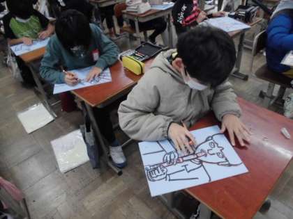 今日の図工では,彫刻刀の使い方を確認しました。安全にケガなく使うためには,左手の位置が重要です。板を彫る時には少し力も必要なので集中しないといけません。みんなで注意することを確かめた後,慎重に彫り進めていました。