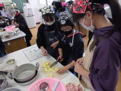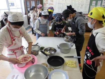 今日は,環境に配慮しながら協力して調理実習をしました。グループで相談して「野菜のベーコン巻き」や「ベーコンポテト」「豆腐と野菜のチャンプルー」の3品から1つ選んで作りました。手順を確認しながら,自分の役割を果たそうとがんばっていました。さりげなく手伝ったり声をかけたりして温かい雰囲気で調理できました。