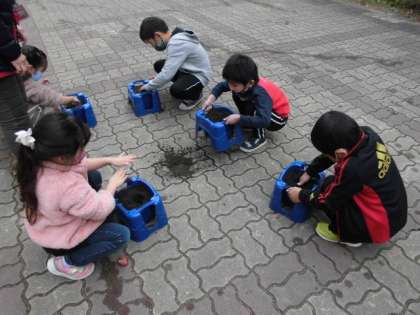 チューリップの球根の観察が終わったので,次は球根を植えることにしました。あらかじめ作っておいた栄養たっぷりの土を自分の植木鉢に入れてもらいました。その後,中庭に移動して球根が隠れるぐらい穴を掘って植えました。最後に水をあげました。春にはどんな花が咲くのか今から楽しみです。