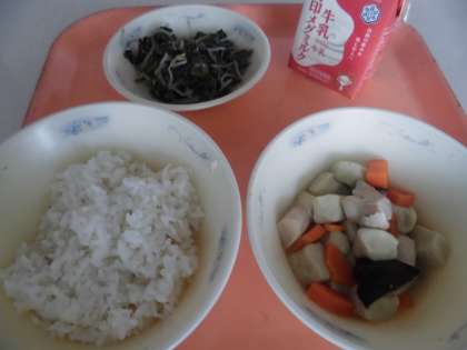 今日の給食では,シイタケの戻し汁・さとう・しょうゆで鶏肉・にんじん・しいたけを煮,別の釜でけずりぶしでとっただし汁・みりん・しょうゆで煮た高野どうふを加えて煮含めて仕上げました。