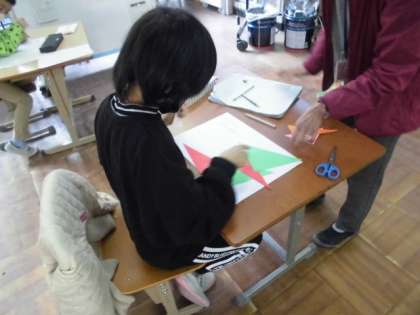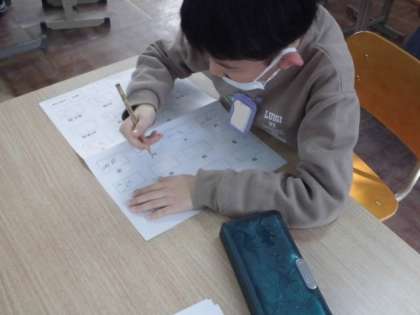 自分の力に合ったプリント学習に取り組みました。三角形や計算の学習をしたり漢字の読み書きの学習をしたりしました。丸をもらうと次の意欲につながっているようで,「よしっ」と言いながら,次の問題に取り組んでいました。