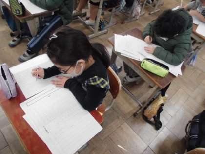 国語では「たから島のぼうけん」という教材を使ってお話づくりの学習をしています。お話全体の起承転結を考えてからあらすじをメモしました。メモをもとに,各場面のお話を下書きしました。今日は,下書きをもとに清書しました。早く書けた人は,お話の下に挿絵を描いていました。
