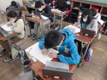 今日の国語では,読み手が納得するような意見文を書きました。今回のテーマは「学生服」です。まず,「あった方がよいか,ない方がよいか」立場をはっきりさせてから自分の主張することを書きました。その主張の理由や根拠,さらには予想される意見も書いた上で,最後にまとめを書くようにしました。文章の構成がはっきりしていると書く順序が分かりやすそうでした。